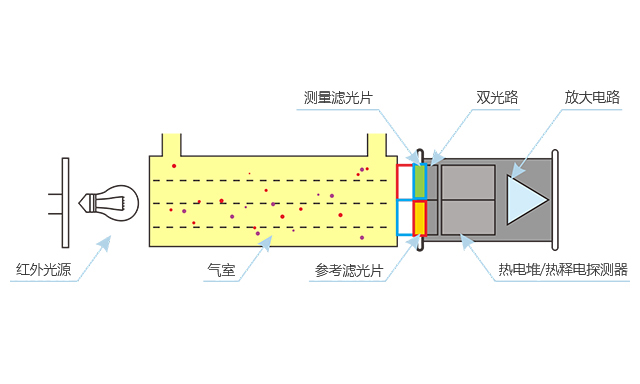雙光束紅外(NDIR)是基于光源和探測器制造工藝的改進(jìn)而產(chǎn)生的新一代紅外測量方法,有別于傳統(tǒng)的非分光紅外(NDIR),雙光束紅外使用電調(diào)制光源方式,探測器上集成參考和測量通道,整體實(shí)現(xiàn)雙通道檢測。由于探測器良好一致性,測量通道對(duì)分析物質(zhì)的存在和濃度非常敏感,而參考通道信號(hào)幾乎不受影響。通過測量和參考信號(hào)的處理,即使在惡劣的溫度和環(huán)境條件下,也能獲得穩(wěn)定可靠的測量結(jié)果,解決了不同氣體之間的交叉干擾、高低溫效應(yīng)、濕度效應(yīng)和組分噪聲效應(yīng)等問題。