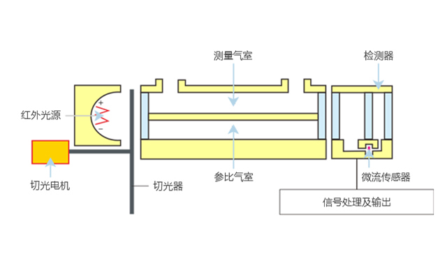 微流紅外(NDIR)技術(shù)基于氣體吸收理論,不同氣體分子會(huì)選擇性吸收光線(xiàn)特定波長(zhǎng)的能量,通過(guò)微流檢測(cè)器檢測(cè)吸收強(qiáng)度的變化,并利用氣體濃度與吸收強(qiáng)度關(guān)系(朗伯-比爾Lambert-Beer)定律鑒別氣體組分并確定其濃度。同時(shí)采用了隔半氣室技術(shù),利用對(duì)紅外光線(xiàn)不吸收的氣體作為參比,可以消除光源衰減,溫度等外部環(huán)境變化的影響。